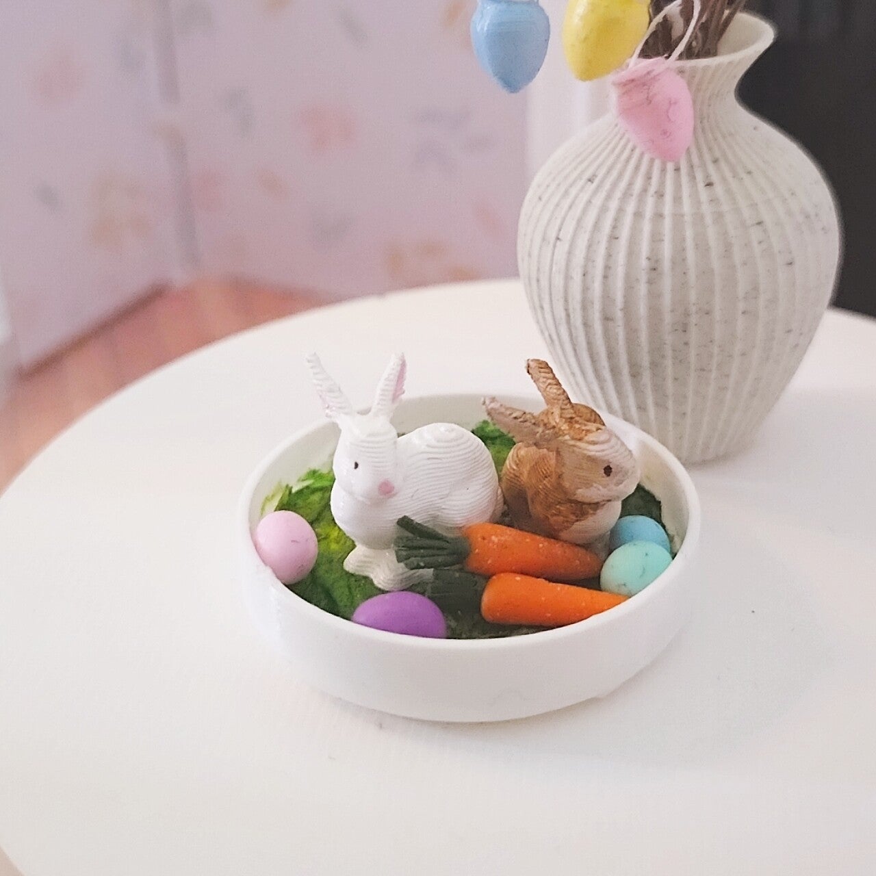 Perfekt som vår eller påskdekor. Brickan och kaniner är 3D printad.