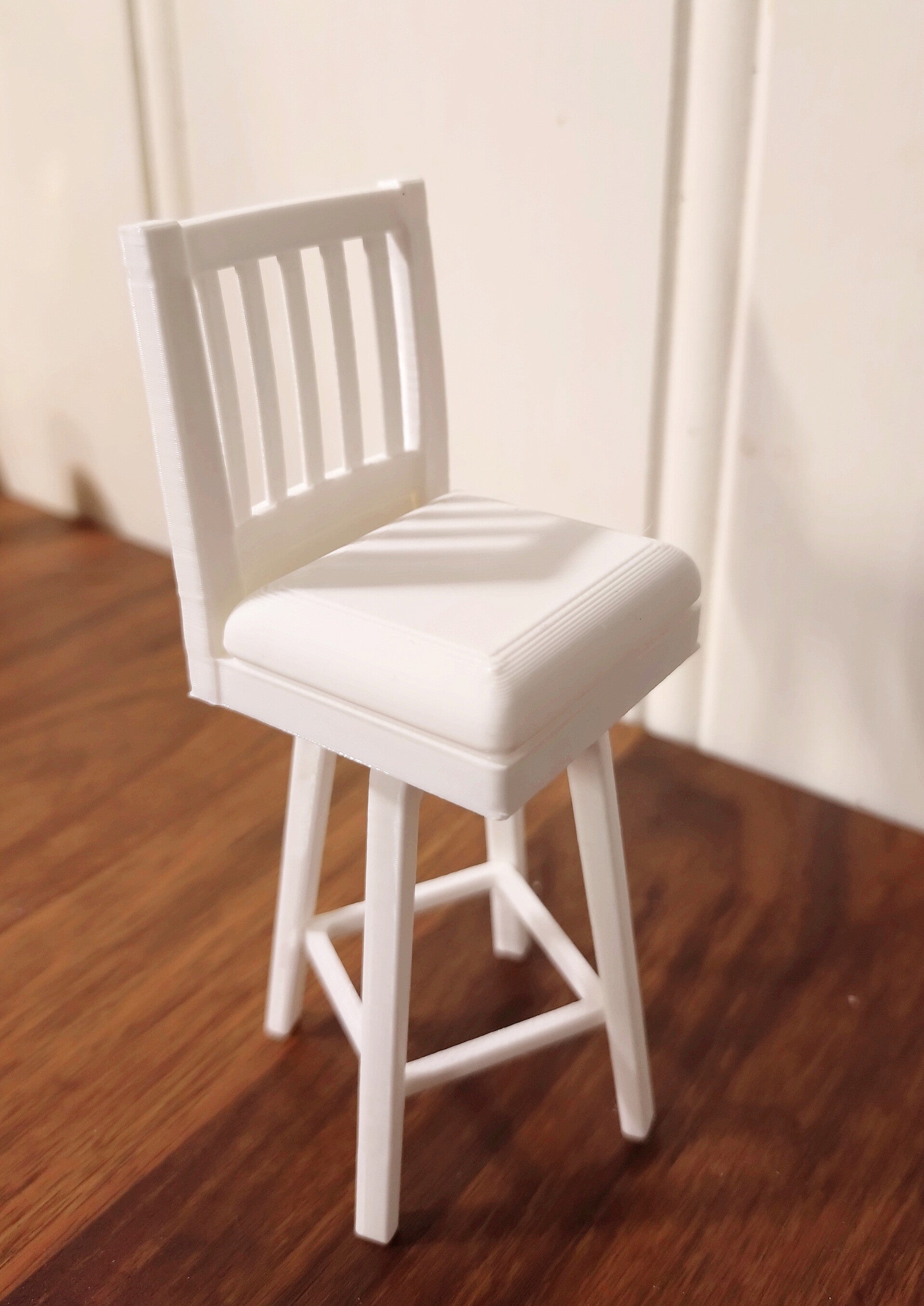 3D printad barstolar i PLA plast. Priset är för 2st stolar som passar perfekt till modernisk dockskåp. Sitthöjd ca 6,8 cm med totalt höjd ca 10 cm. Omålade. Görs inom 2-3 dagar.