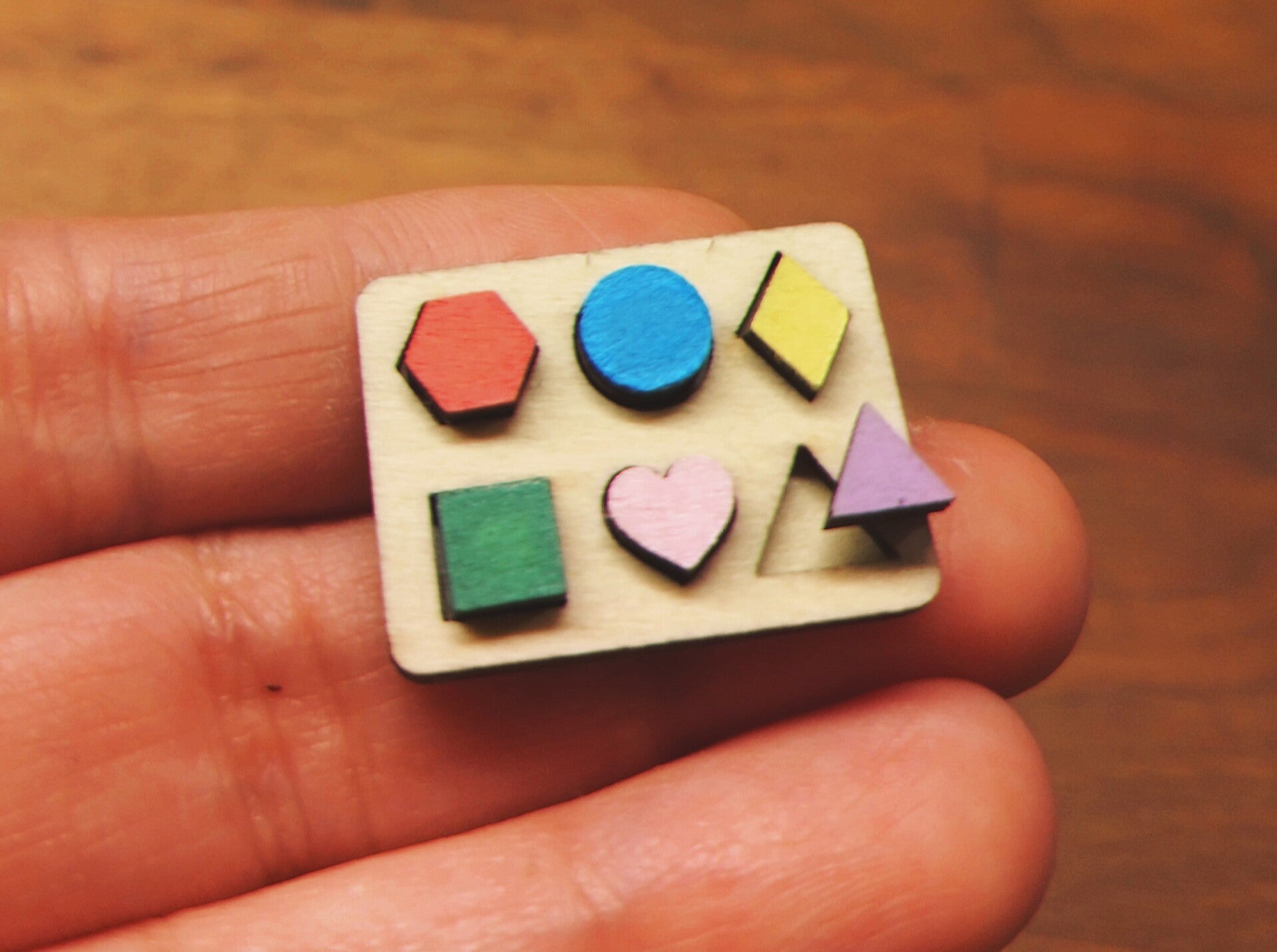 Ett litet pussel till miniatyr barnrum med olika former och färger. Mått ca. 1,9 x 2,6 cm. Gjord i trä.