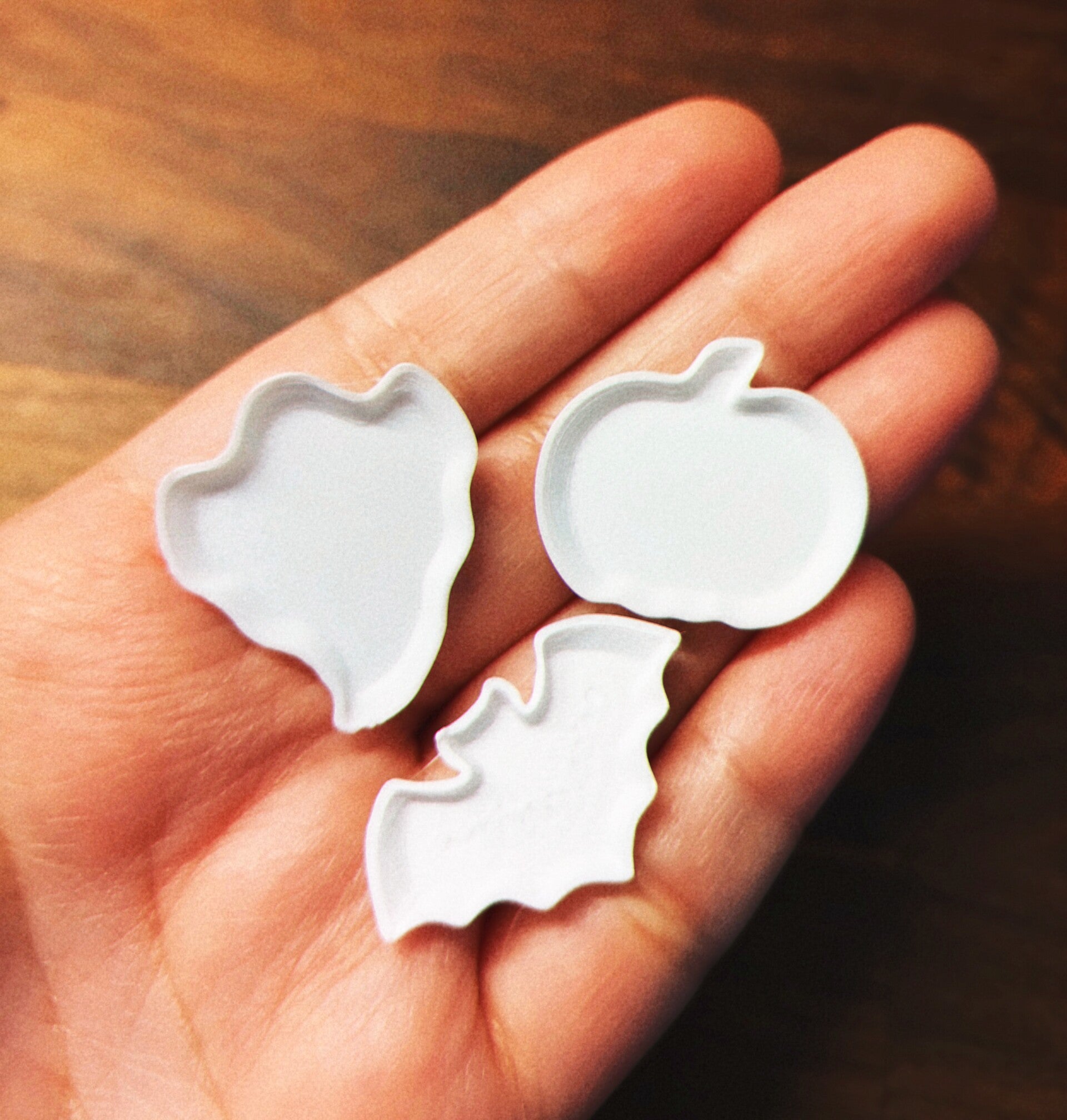 Miniatyr tallrikset med Halloween tema. Innehåller en pumpa, ett spöke och en fladdermus. 3D printade i PLA plast. Omålade.