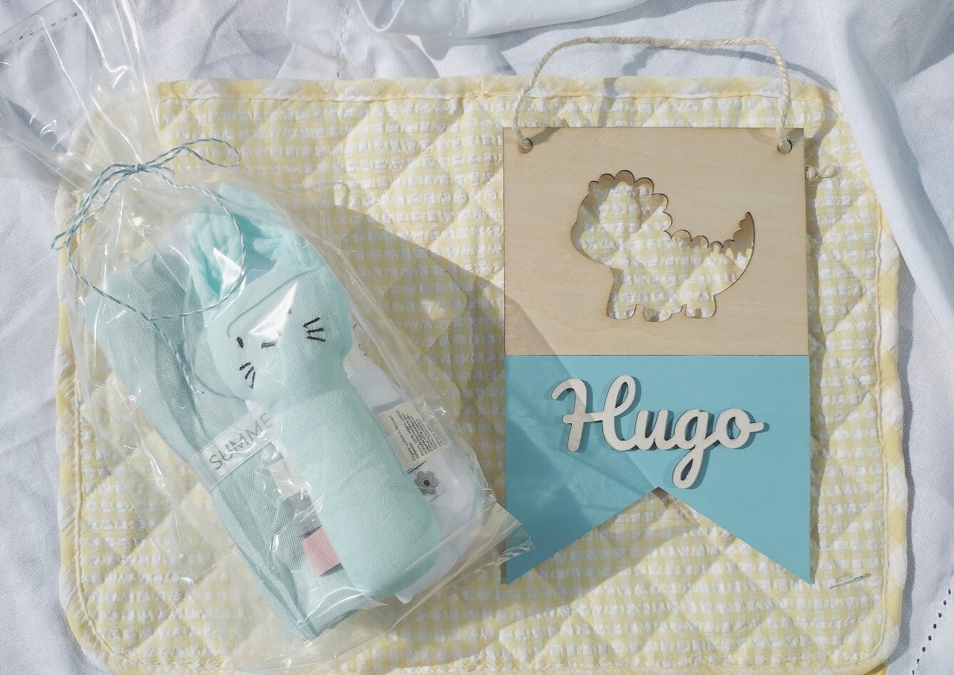 Ett perfekt present set för nyfödda med 2st muslinfilt, mjuk skallra kanin och en gullig namnskylt.