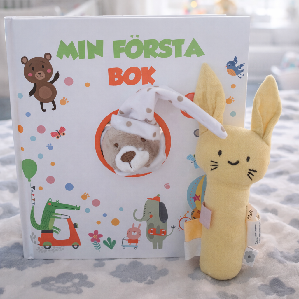 Detta gåvoset innehåller en vackert illustrerad fyll-i-bok för barnets första år. Boken har en löstagbar snuttedocka följer med och kikar lekfullt fram ur boken – en extra trygg detalj för de minsta.